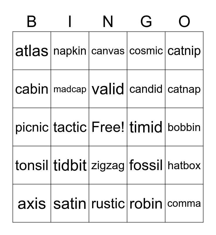 This bingo card has a free space and 24 words: tidbit, satin, valid, axis, catnip, atlas, cabin, napkin, timid, zigzag, candid, picnic, fossil, hatbox, madcap, robin, bobbin, canvas, catnap, tactic, comma, tonsil, cosmic and rustic.