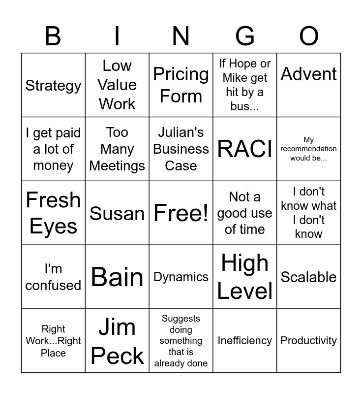 This bingo card has a free space and 24 words: Bain, Jim Peck, Julian's Business Case, Right Work...Right Place, Advent, Strategy, I get paid a lot of money, Low Value Work, Not a good use of time, Dynamics, RACI, Fresh Eyes, High Level, Scalable, Too Many Meetings, Inefficiency, I don't know what I don't know, Pricing Form, My recommendation would be..., Susan, Productivity, I'm confused, If Hope or Mike get hit by a bus... and Suggests doing something that is already done.