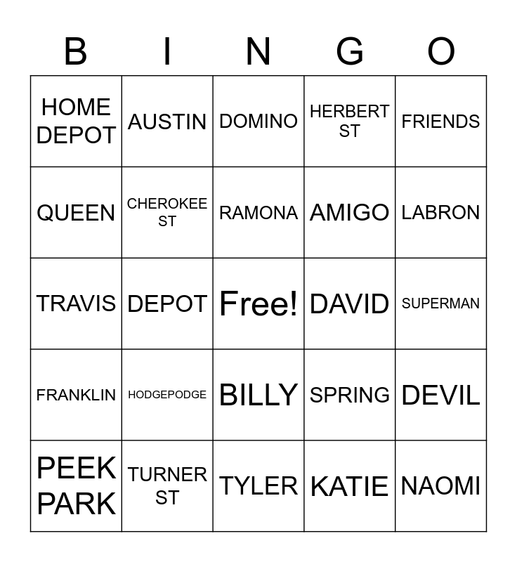 This bingo card has a free space and 274 words: AARON, ADRIEL, ALEX, ALLISON, AMY, ANDRE, ANNA, AUSTIN, BARRY, BILLY, BLAKE, BRADLEY, BRAYDEN, BRYCE, CADE, CASEY, CHANCE, CHASE, CHRIS, CHRISTOPHER, CLIFFORD, CRAIG, DAN, DANIEL, DAVID, DAWN, DEREK, DESTIN, DRENN, DUSTIN, EARL, EDWARD, FELIX, FRANK, GREG, HEATHER, HOLLIS, HOLLYWOOD, JAMIE, SHUMAN, JAY, JEFF, JEREMY, JERRY, JESSE, JODY, JONATHAN, JOSE, JOSEPH, JOSH, JOSHUA, KALEB, KATIE, KAYCI, KELVIN, KEVIN, KIRSTIE, KYLE, LABRON, LANCE, LISA, LOGAN, LUTHER, MARK, MATT, MATTHEW, MICHAEL, NAOMI, NEAL, OSCAR, QUEEN MITZI, RALPH, RAMONA, RANDY, REED, RICKY, RYAN, SCOTT, STACY, TIMMY, TODD, TRACY, TRAVIS, TRYSTAN, TYLER, WILLIAM, YARELI, ZACKERY, BIG SPRINGS, CITY HALL, POLICE, FIRE, WASTEWATER, WATER, PUBLIC WORKS, RECREATION, TOURISM, DEPOT, HOLLOWAY, CPAC, SILVER COMET, WOMENS BLDG, WINNIE, PHILPOT, EAST AVE, LYNTON, MAIN, FIRE TRUCK, POLICE CAR, 3 QUOTES, YO, CRY BABY, SNITCH, SUPERSTAR, RETIREMENT, PAYCHECK, PINEAPPLE, MOWER, DUMP TRUCK, SLUDGE, FOOTBALL, BASEBALL, SOCCER, TENNIS, PAYTON, FOSTER, TUCK, CARTER, BRANCH, ATTITUDE, POSITIVE, AGENDA, GRUMPY CAT, SMILE, BULLDOG, BABYFACE, SCHOOL, DIANA G., FALL, SPRING, WINTER, SUMMER, PEEK PARK, TURNER ST, BERT WOOD, JULE PEEK, ESSEX, QUEEN, PRIOR ST, WEST AVE, COLLEGE, GIBSON ST, MARIETTA ST, SUPERMAN, BATMAN, IRON MAN, BLACK WIDOW, HULK, HAWKEYE, THOR, DWIGHT, PAM, MICHAEL, SPONGEBOB, BELLBOTTOMS, FAMILY, FRIENDS, WAFFLE HOUSE, HUDDLE HOUSE, VARSITY, CHICK FIL A, TACO BELL, MCDONALDS, HOME DEPOT, WALMART, KROGER, ZORBAS, PETROS, BAMBOOZLE, LOLLYGAG, SCUTTLEBUTT, GOSSIP, HOODWINK, HODGEPODGE, POTPOURRI, NINCOMPOOP, GO DAWGS, HEADACHE, ULCER, BARBIE, COOKIE, WHISKEY, ANGEL, DEVIL, LEAF, PARASITE, ONE DOOR, CVS, KRYSTAL, BIZARRE, PARADE, WITCHCRAFT, FRANKLIN, WIMPY, DELANO, ROOSEVELT, BLEEP, DOMINO, SUNNY, COPIER, HEADS, SHOULDER, KNEES, TOES, GRINCH, CRAZY, LOCO, TACO, HOLA, FLAG, GRATEFUL, THANKFUL, BLESSED, LICENSE, ADIOS, AMIGO, GRACIAS, CASA, WORK, TRABAJO, JOYCE, RACHEL, JP, RAUL, BUMBERSHOOT, FIRING RANGE, GUN, BULLET, LEAF, POST IT, PHONE, BILLS, LOONEY, CROCODILE, ESOM HILL, WISSAHICKON, STAGE, BONO, TAXES, VICTORIA, MARTHA LANE, MUNDY'S LAKE, HERBERT ST, NOYES ST, ROCK ST, AT&T, CEDARSTREAM, OLD CASTLE, CAN AM, CIRCUS, ELLAWOOD, JOHN HAND, PIEDMONT, PINE ST, CHESTNUT ST, SPRUCE ST, FURNACE ST, MAY ST, CHEROKEE ST, CLEO ST, LINE ST, MLK, PACE ST and JONES ST.