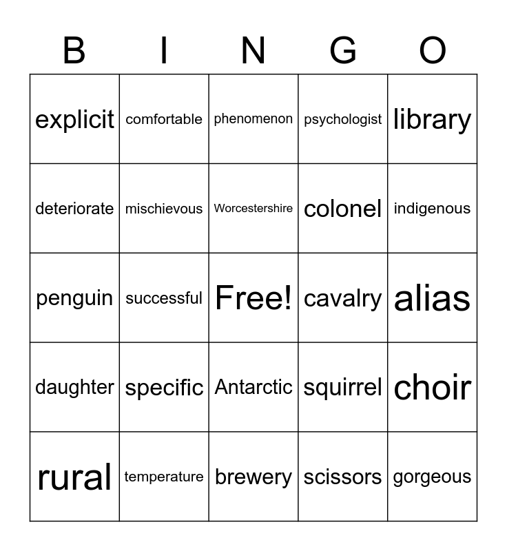 This bingo card has a free space and 24 words: specific, temperature, Worcestershire, rural, library, explicit, deteriorate, comfortable, cavalry, Antarctic, colonel, penguin, squirrel, choir, mischievous, scissors, alias, phenomenon, indigenous, successful, gorgeous, daughter, psychologist and brewery.