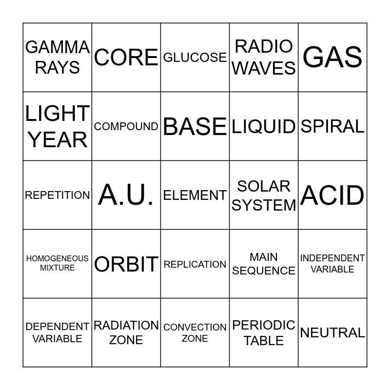 This bingo card has a free space and 24 words: ORBIT, RADIATION ZONE, BASE, DEPENDENT VARIABLE, GAS, GAMMA RAYS, LIGHT YEAR, CORE, SOLAR SYSTEM, REPLICATION, LIQUID, REPETITION, MAIN SEQUENCE, INDEPENDENT VARIABLE, COMPOUND, PERIODIC TABLE, ACID, GLUCOSE, SPIRAL, A.U., NEUTRAL, HOMOGENEOUS MIXTURE, RADIO WAVES and CONVECTION ZONE.