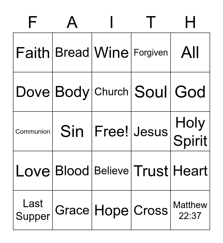 This bingo card has a free space and 28 words: Heart, Mind, Soul, Cross, Dove, Wine, Bread, Love, Jesus, Last Supper, Communion, Forgiven, Grace, Hope, God, Prayer, Blood, Body, Church, Believe, Faith, Bible, Matthew 22:37, Sin, Holy Spirit, Trust, All and Savior.