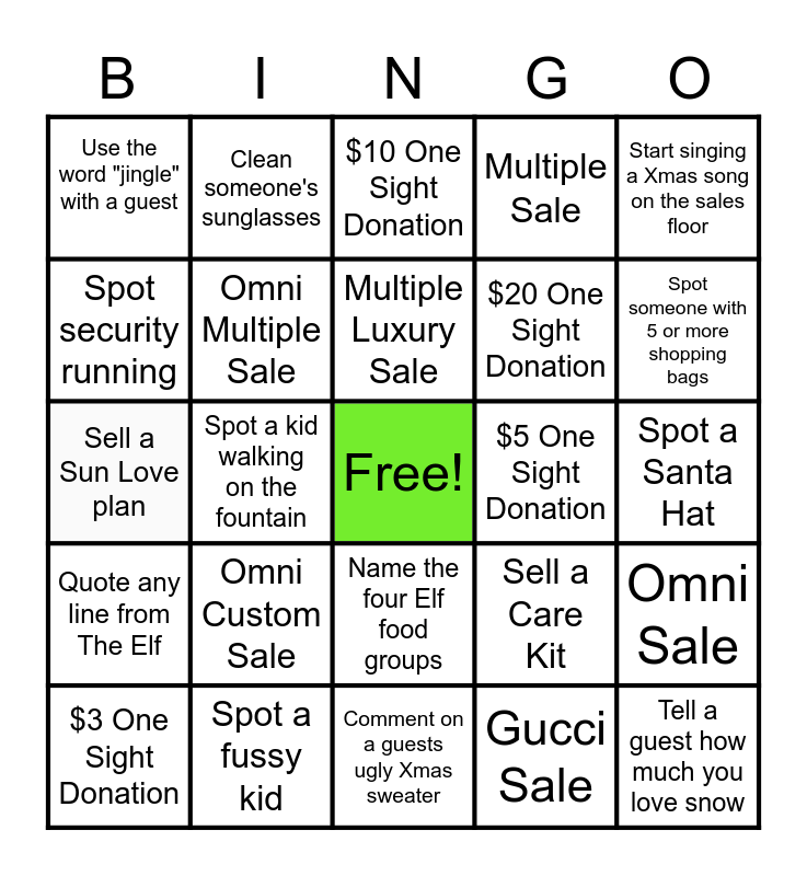 This bingo card has a free space and 27 words: Sell a Care Kit, Ray Ban Stories Sale, $20 One Sight Donation, Comment on a guests ugly Xmas sweater, Spot security running, $10 One Sight Donation, Clean someone's sunglasses, Quote any line from The Elf, $5 One Sight Donation, Omni Sale, Sell a Sun Love plan, Multiple Sale, $3 One Sight Donation, Spot a fussy kid, Spot someone with 5 or more shopping bags, Use the phrase "Razzle Dazzle" w/a guest, Omni Multiple Sale, Multiple Luxury Sale, Omni Custom Sale, Use the word "jingle" with a guest, Spot a Santa Hat, Gucci Sale, Spot a kid walking on the fountain, Tell a guest how much you love snow, Name the four Elf food groups, Start singing a Xmas song on the sales floor and Explain how we can't "double dip"a discount.