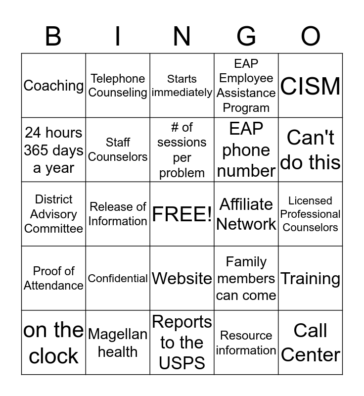 This bingo card has a free space and 24 words: Confidential, Magellan health, # of sessions per problem, on the clock, CISM, Coaching, 24 hours 365 days a year, Telephone Counseling, Affiliate Network, Website, EAP phone number, District Advisory Committee, Family members can come, Training, Staff Counselors, Resource information, Licensed Professional Counselors, Starts immediately, Can't do this, Release of Information, Call Center, Proof of Attendance, EAP Employee Assistance Program and Reports to the USPS.