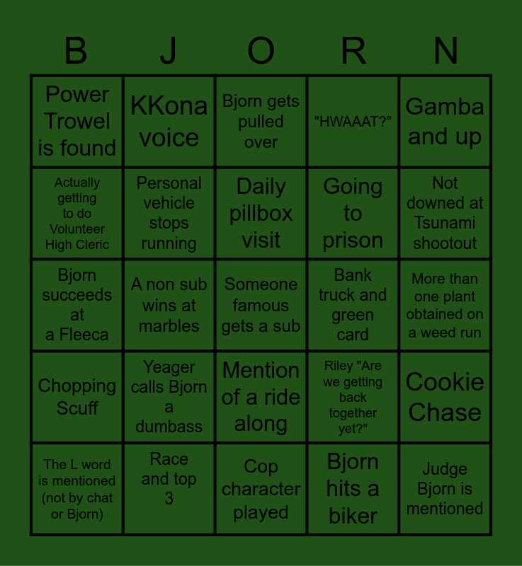 This bingo card has a free space and 24 words: Yeager calls Bjorn a dumbass, Race and top 3, Daily pillbox visit, The L word is mentioned (not by chat or Bjorn), Gamba and up, Power Trowel is found, Actually getting to do Volunteer High Cleric, KKona voice, Bank truck and green card, Mention of a ride along, Going to prison, Bjorn succeeds at a Fleeca, Riley "Are we getting back together yet?", Cookie Chase, Personal vehicle stops running, Bjorn hits a biker, More than one plant obtained on a weed run, Bjorn gets pulled over, Not downed at Tsunami shootout, A non sub wins at marbles, Judge Bjorn is mentioned, Chopping Scuff, "HWAAAT?" and Cop character played.