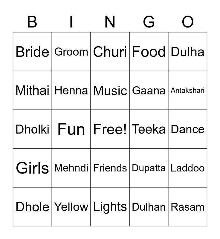 This bingo card has a free space and 24 words: Dhole, Mehndi, Music, Dulhan, Dulha, Bride, Groom, Churi, Teeka, Dance, Dholki, Henna, Dupatta, Laddoo, Mithai, Yellow, Lights, Food, Antakshari, Girls, Fun, Friends, Gaana and Rasam.