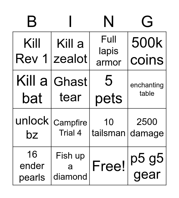 This bingo card has 17 words: Free!, 16 ender pearls, Full lapis armor, Kill Rev 1, Campfire Trial 4, 500k coins, 2500 damage, 5 pets, enchanting table, Ghast tear, Fish up a diamond, 10 tailsman, Kill a bat, Kill a zealot, unlock bz, 25 fairy souls and p5 g5 gear.