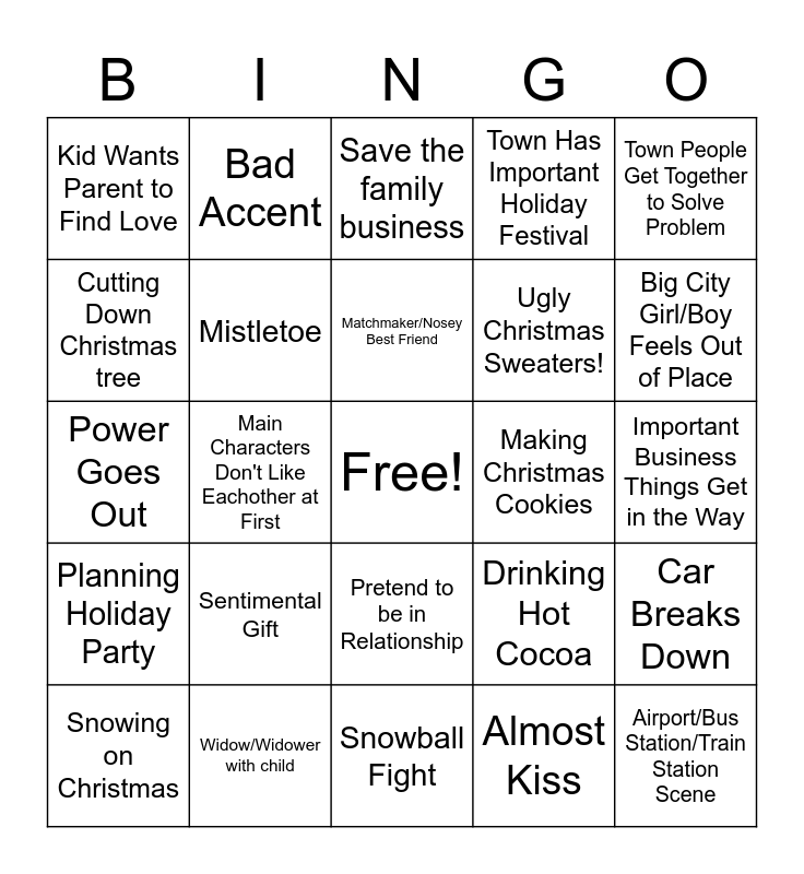 This bingo card has a free space and 27 words: Drinking Hot Cocoa, Career Comes First, Ugly Christmas Sweaters!, Snowball Fight, Cutting Down Christmas tree, Save the family business, Bad Accent, Planning Holiday Party, Making Christmas Cookies, Car Breaks Down, Power Goes Out, Town Has Important Holiday Festival, Snowing on Christmas, Widow/Widower with child, Big City Girl/Boy Feels Out of Place, Christmas Caroling, Mistletoe, Matchmaker/Nosey Best Friend, Sentimental Gift, Kid Wants Parent to Find Love, Important Business Things Get in the Way, Almost Kiss, Main Characters Don't Like Eachother at First, Airport/Bus Station/Train Station Scene, Pretend to be in Relationship, Town People Get Together to Solve Problem and Best Friend or Assistant is Minority.