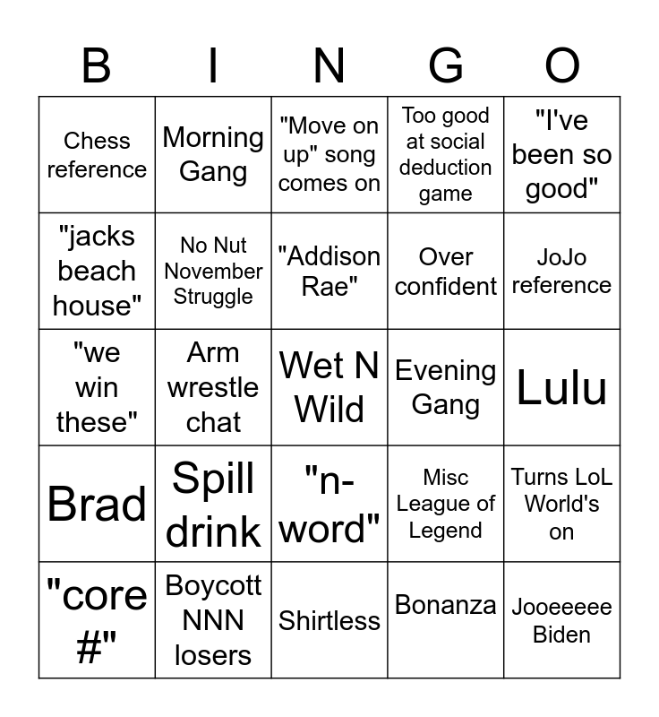 This bingo card has 25 words: Spill drink, Shirtless, "Addison Rae", "core #", "I've been so good", Chess reference, "jacks beach house", Morning Gang, Evening Gang, "n-word", Over confident, "we win these", Misc League of Legend, Turns LoL World's on, No Nut November Struggle, Jooeeeee Biden, Lulu, "Move on up" song comes on, JoJo reference, Arm wrestle chat, Wet N Wild, Boycott NNN losers, Brad, Too good at social deduction game and Bonanza.