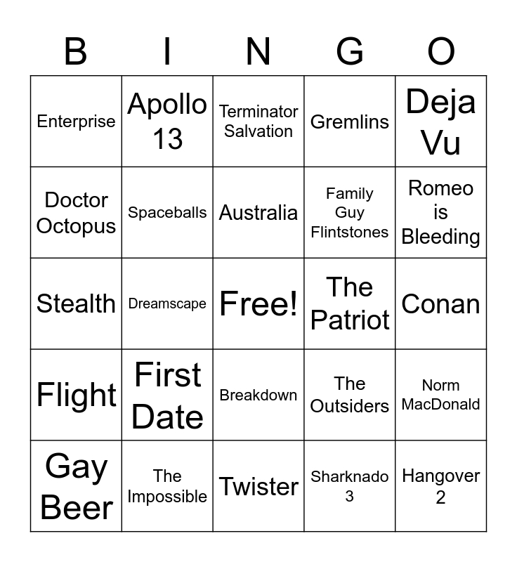 This bingo card has a free space and 63 words: 8 Mile, 13 Minutes, Field of Dreams, Norm MacDonald, Across the Universe, Apocalypse Now, Apollo 13, August Rush, Australia, The Matrix, Breakdown, Casino Royale, Conan, Deja Vu, Die Hard, Doctor Octopus, Dreamscape, Enterprise, Family Guy Peanuts, Family Guy Flintstones, First Date, Flight, Gremlins, ID 1, ID 2, John Wick, Kill Bill, King Kong, Amusment, Tomb Raider, Lord of the Flies, Empire Strikes Back, Monster in Law, Kenobi, Romeo is Bleeding, Gay Beer, See, Sharknado 3, Sling Blade, Spaceballs, Stealth, The Patriot, Bourne Supremacy, Larry the Cable Guy, Hangover 2, The Impossible, Longest Yard, The Outsiders, Chelsea, Three Amigos, Titanic, Twister, Wanda Sykes, War Games, Warriors, Terminator Salvation, What Women Want, Wonder Woman, WW Z, Wrath of Khan, Wyatt Earp, Stand By Me and Zombieland.