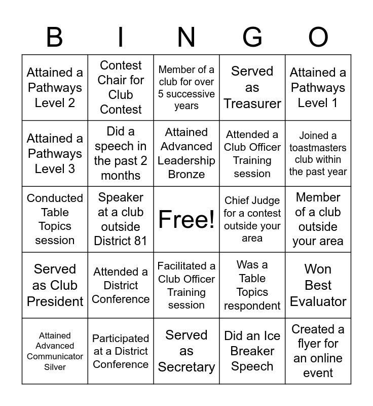 This bingo card has a free space and 24 words: Attended a District Conference, Participated at a District Conference, Attained Advanced Leadership Bronze, Attained Advanced Communicator Silver, Attained a Pathways Level 1, Attained a Pathways Level 2, Attained a Pathways Level 3, Contest Chair for Club Contest, Chief Judge for a contest outside your area, Facilitated a Club Officer Training session, Attended a Club Officer Training session, Conducted Table Topics session, Was a Table Topics respondent, Won Best Evaluator, Did a speech in the past 2 months, Did an Ice Breaker Speech, Member of a club outside your area, Member of a club for over 5 successive years, Joined a toastmasters club within the past year, Speaker at a club outside District 81, Created a flyer for an online event, Served as Club President, Served as Treasurer and Served as Secretary.