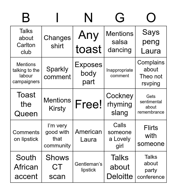 This bingo card has a free space and 24 words: I’m very good with that community, Shows CT scan, Exposes body part, South African accent, Says peng Laura, Talks about Carlton club, Mentions talking to the labour campaigners, Changes shirt, Cockney rhyming slang, American Laura, Inappropriate comment, Toast the Queen, Calls someone a Lovely girl, Flirts with someone, Sparkly comment, Talks about Deloitte, Gets sentimental about remembrance, Any toast, Complains about Theo not rsvping, Mentions Kirsty, Talks about party conference, Comments on lipstick, Mentions salsa dancing and Gentleman’s lipstick.