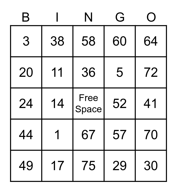 This bingo card has a free space and 24 words: 1, 17, 36, 49, 64, 3, 20, 38, 52, 67, 5, 24, 57, 70, 11, 29, 41, 58, 72, 14, 30, 44, 60 and 75.