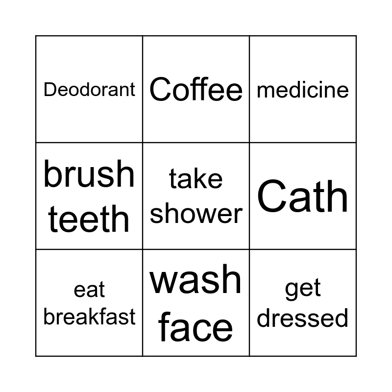 This bingo card has a free space and 8 words: Cath, medicine, Coffee, eat breakfast, Deodorant, get dressed, brush teeth and wash face.