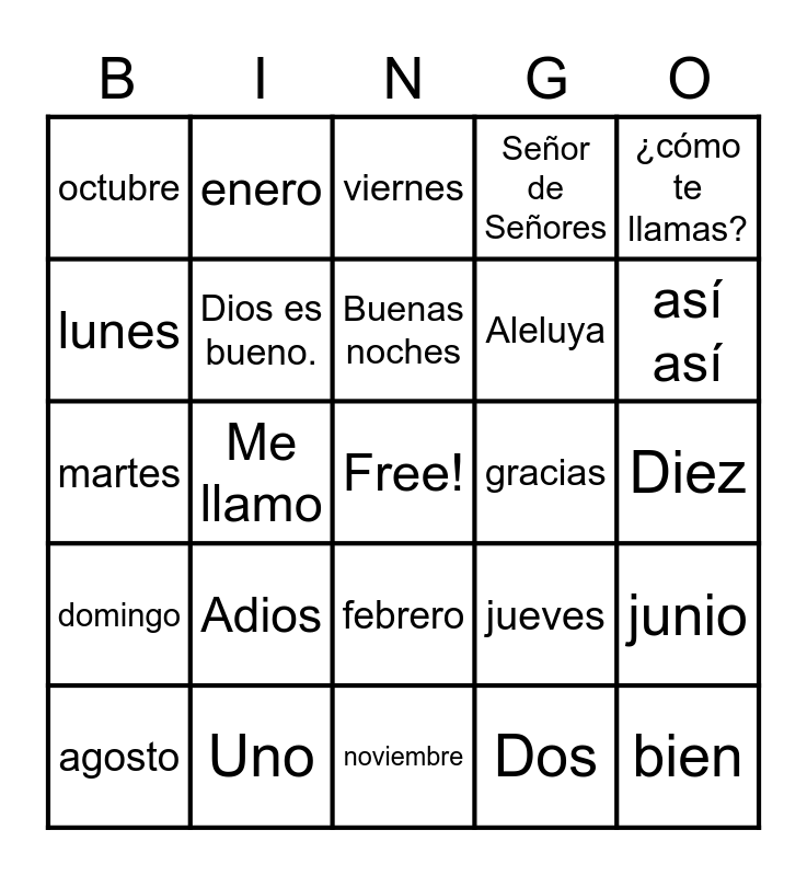 This bingo card has a free space and 56 words: julio, agosto, septiembre, octubre, noviembre, Dios te bendiga., Dios es bueno., Amén., Aleluya, Gloria a Dios., Señor de Señores, Rey de Reyes, Salvación, Vida eterna, hola, Buenos días, ¿cómo te llamas?, Me llamo, ¿Cómo estás?, bien, gracias, Buenas tardes, jueves, viernes, sábado, Buenas noches, Mucho gusto, muy bien, así así, Hasta luego, Seis, Siete, Ocho, Nueve, Diez, lunes, martes, miércoles, domingo, enero, febrero, marzo, abril, mayo, sí, Adios, Uno, Hoy, Mañana, La mañana, Dos, Tres, Cuatro, Cinco, junio and diciembre.