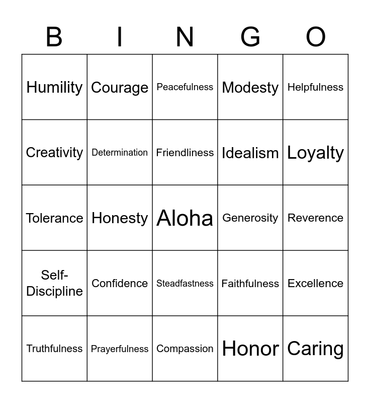 This bingo card has a free space and 52 words: Assertiveness, Caring, Cleanliness, Compassion, Confidence, Consideration, Courage, Courtesy, Creativity, Detachment, Determination, Enthusiasm, Excellence, Faithfulness, Flexibility, Forgiveness, Friendliness, Generosity, Gentleness, Helpfulness, Honesty, Honor, Humility, Idealism, Joyfulness, Justice, Kindness, Love, Loyalty, Mercy, Moderation, Modesty, Obedience, Orderliness, Patience, Peacefulness, Prayerfulness, Purposefulness, Reliabillity, Respect, Responsibility, Reverence, Self-Discipline, Service, Steadfastness, Tact, Thankfulness, Tolerance, Trust, Trustworthiness, Truthfulness and Unity.