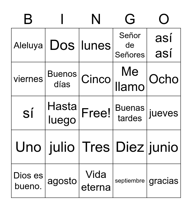 This bingo card has a free space and 56 words: Dios te bendiga., Dios es bueno., Amén., Aleluya, Vida eterna, hola, Buenos días, ¿cómo te llamas?, Me llamo, Gloria a Dios., Señor de Señores, Rey de Reyes, Salvación, ¿Cómo estás?, Mucho gusto, muy bien, así así, Hasta luego, bien, gracias, Buenas tardes, Buenas noches, Diez, lunes, martes, Cinco, Seis, Siete, Ocho, sábado, domingo, enero, febrero, miércoles, jueves, viernes, sí, Adios, Uno, Dos, Tres, Cuatro, Nueve, noviembre, diciembre, julio, agosto, octubre, Hoy, Mañana, septiembre, marzo, abril, mayo, junio and La mañana.