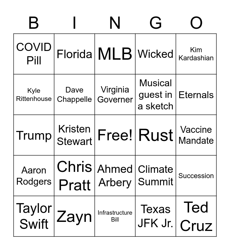 This bingo card has a free space and 25 words: Chris Pratt, Infrastructure Bill, Virginia Governer, Taylor Swift, Kim Kardashian, COVID Pill, Kyle Rittenhouse, Florida, Rust, Ahmed Arbery, Musical guest in a sketch, Trump, Climate Summit, Succession, Dave Chappelle, Halloween, Vaccine Mandate, MLB, Eternals, Kristen Stewart, Ted Cruz, Zayn, Aaron Rodgers, Wicked and Texas JFK Jr..