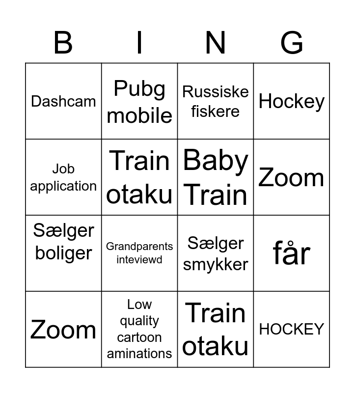 This bingo card has 20 words: får, Portrait phone recording, Russiske fiskere, Indian youtube star, Zoom, Job application, Low quality cartoon aminations, Dashcam, Sælger boliger, Pubg mobile, Grandparents inteviewd, Sælger smykker, Train otaku, HOCKEY, Baby Train, Static camera trafik, Zoom, Hockey, Train otaku and Baby train.