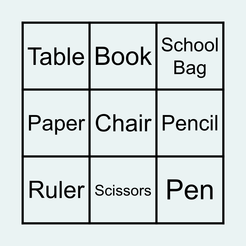 This bingo card has a free space and 8 words: Pencil, School Bag, Book, Ruler, Table, Pen, Paper and Scissors.