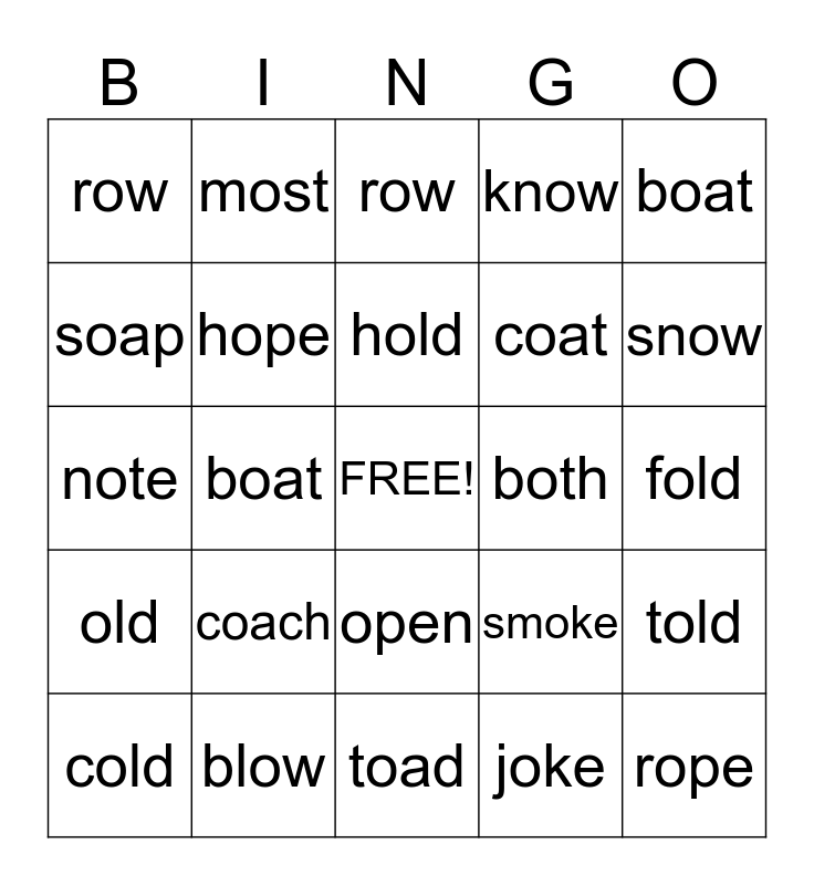 This bingo card has a free space and 24 words: coach, blow, hold, cold, boat, row, soap, most, both, open, coat, note, smoke, told, hope, joke, fold, row, snow, boat, rope, old, know and toad.