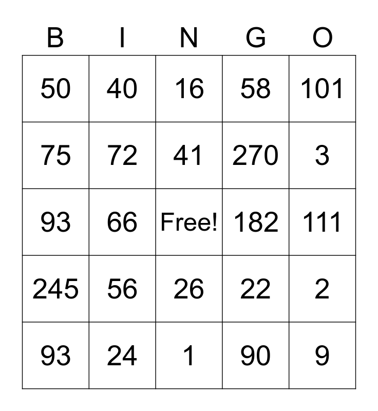 This bingo card has a free space and 24 words: 56, 24, 41, 93, 101, 50, 75, 40, 182, 26, 270, 93, 22, 2, 72, 90, 111, 16, 3, 66, 9, 245, 58 and 1.