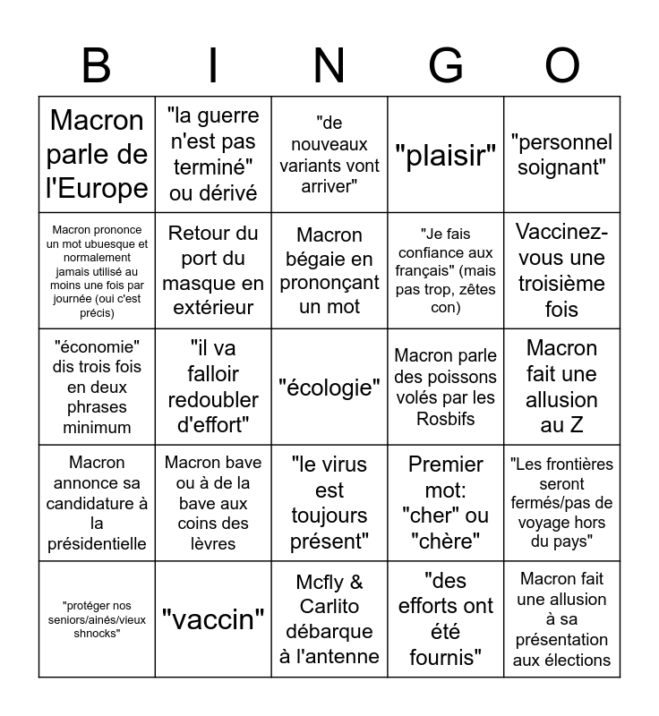 This bingo card has a free space and 24 words: Macron bave ou à de la bave aux coins des lèvres, "vaccin", Macron bégaie en prononçant un mot, "protéger nos seniors/ainés/vieux shnocks", "personnel soignant", Macron parle de l'Europe, Macron prononce un mot ubuesque et normalement jamais utilisé au moins une fois par journée (oui c'est précis), "la guerre n'est pas terminé" ou dérivé, Macron parle des poissons volés par les Rosbifs, "le virus est toujours présent", "Je fais confiance aux français" (mais pas trop, zêtes con), "économie" dis trois fois en deux phrases minimum, Premier mot: "cher" ou "chère", "Les frontières seront fermés/pas de voyage hors du pays", Retour du port du masque en extérieur, "des efforts ont été fournis", Macron fait une allusion au Z, "de nouveaux variants vont arriver", Vaccinez-vous une troisième fois, "il va falloir redoubler d'effort", Macron fait une allusion à sa présentation aux élections, Macron annonce sa candidature à la présidentielle, "plaisir" and Mcfly & Carlito débarque à l'antenne.