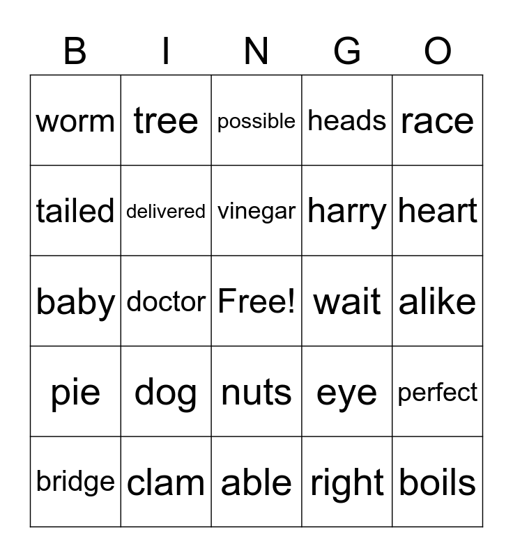 This bingo card has a free space and 56 words: buts, bridge, collected, worm, able, blue, delivered, nine, harry, go, heads, basket, dozen, bush, earned, feather, race, doctor, words, boils, wait, grass, eye, possible, work, vinegar, treasure, book, heart, laughter, thumb, lining, pod, grease, alike, tailed, baby, dollar, pie, tree, nuts, apple, cake, tea, bite, dog, clam, money, mouth, pants, right, picture, home, eggs, perfect and beauty.