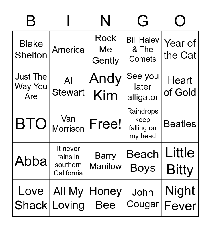 This bingo card has a free space and 32 words: John Cougar, Boogie Oogie Oogie, Van Morrison, Wild Night, Abba, Al Stewart, Year of the Cat, Little Bitty, America, Bend Me, Shape Me, Andy Kim, Rock Me Gently, Aretha Franklin, BJ Thomas, Raindrops keep falling on my head, B52's, Love Shack, BTO, Barry Manilow, It never rains in southern California, Beach Boys, I get around, Beatles, All My Loving, Night Fever, Bill Haley & The Comets, See you later alligator, Just The Way You Are, Blake Shelton, Honey Bee, Blondie and Heart of Gold.