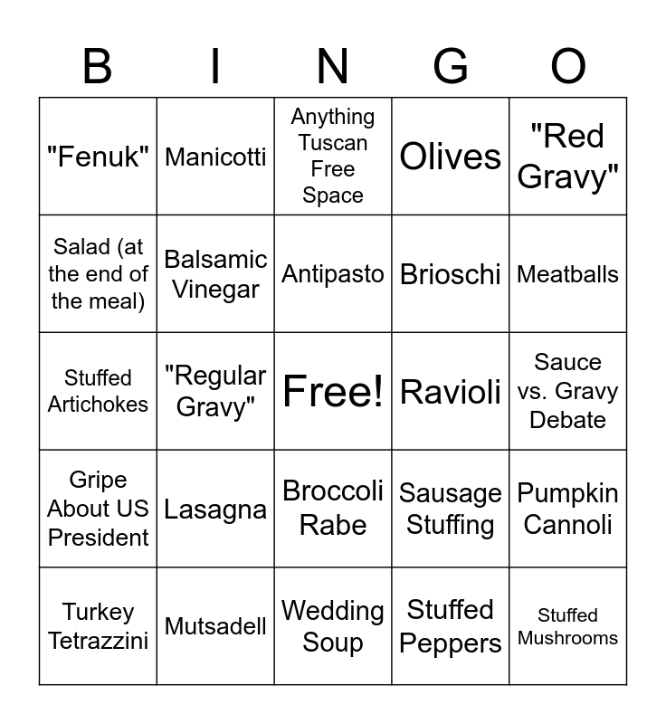 This bingo card has a free space and 25 words: Lasagna, Wedding Soup, Antipasto, Turkey Tetrazzini, "Red Gravy", "Fenuk", Salad (at the end of the meal), Manicotti, Ravioli, Broccoli Rabe, Brioschi, Stuffed Artichokes, Sausage Stuffing, Pumpkin Cannoli, Balsamic Vinegar, Chicken Parm, Sauce vs. Gravy Debate, Anything Tuscan Free Space, Meatballs, "Regular Gravy", Stuffed Mushrooms, Mutsadell, Gripe About US President, Olives and Stuffed Peppers.
