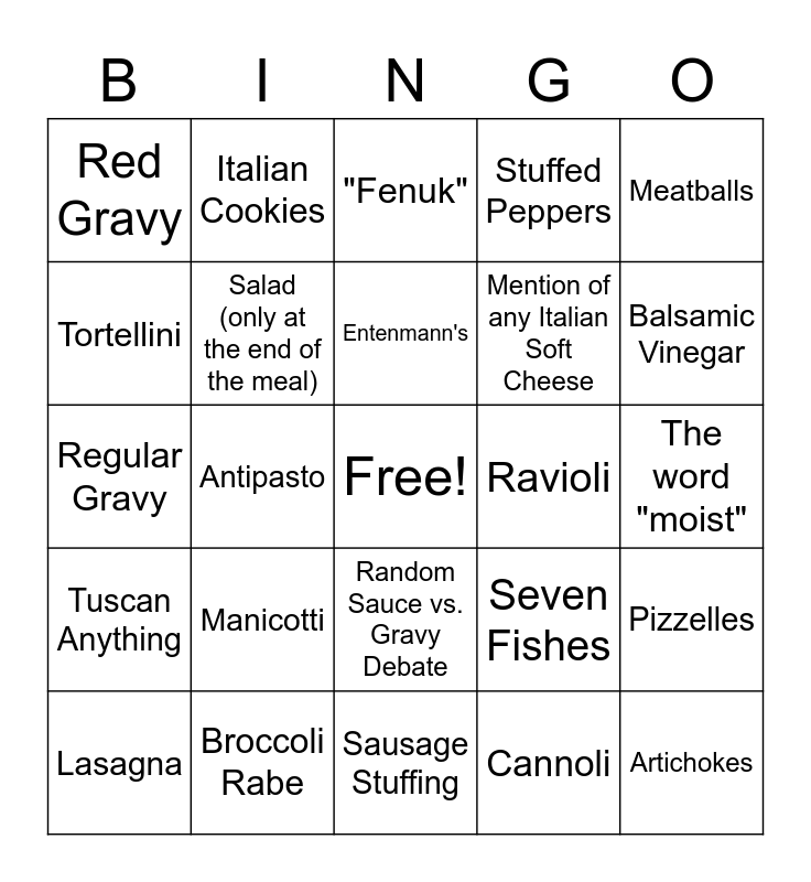This bingo card has a free space and 29 words: Lasagna, Wedding Soup, Antipasto, Turkey Tetrazzini Leftovers, Red Gravy, "Fenuk", Salad (only at the end of the meal), Manicotti, Ravioli, Broccoli Rabe, The word "moist", Artichokes, Sausage Stuffing, Cannoli, Balsamic Vinegar, Chicken Parm, Random Sauce vs. Gravy Debate, Tuscan Anything, Meatballs, Regular Gravy, Seven Fishes, Locatelli, Mention of any Italian Soft Cheese, Tortellini, Stuffed Peppers, Italian Cookies, Pizzelles, Entenmann's and "My nonna still drives.".