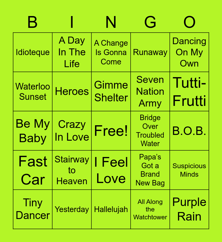 This bingo card has a free space and 75 words: Respect, Fight The Power, A Change Is Gonna Come, Like a Rolling Stone, Smells Like Teen Spirit, What's Going On, Strawberry Fields Forever, Get Ur Freak On, Dreams, Hey Ya!, God Only Knows, Superstition, Gimme Shelter, Waterloo Sunset, I Want To Hold Your Hand, Crazy In Love, Bohemian Rhapsody, Purple Rain, Imagine, Dancing On My Own, Strange Fruit, Be My Baby, Heroes, A Day In The Life, Runaway, A Case of You, Born to Run, Once in a Lifetime, Nuthin' But A "G" Thang, Royals, (I Can't Get No) Satisfaction, Juicy, Johnny B. Goode, Papa’s Got a Brand New Bag, Tutti-Frutti, Seven Nation Army, When Doves Cry, (Sittin' On) the Dock of the Bay, B.O.B., All Along the Watchtower, Love Will Tear Us Apart, Redemption Song, My Girl, Billie Jean, Alright, Paper Planes, Tiny Dancer, Idioteque, Doo Wop (That Thing), Gasolina, Walk on By, I Feel Love, Good Vibrations, The Tracks of My Tears, Like a Prayer, Work It, Family Affair, The Weight, The Message, Running Up That Hill, Stairway to Heaven, One, Jolene, Blitzkrieg Bop, September, Bridge Over Troubled Water, Tangled Up in Blue, Good Times, All Too Well, Suspicious Minds, Fast Car, Yesterday, Formation, Hallelujah and Common People.