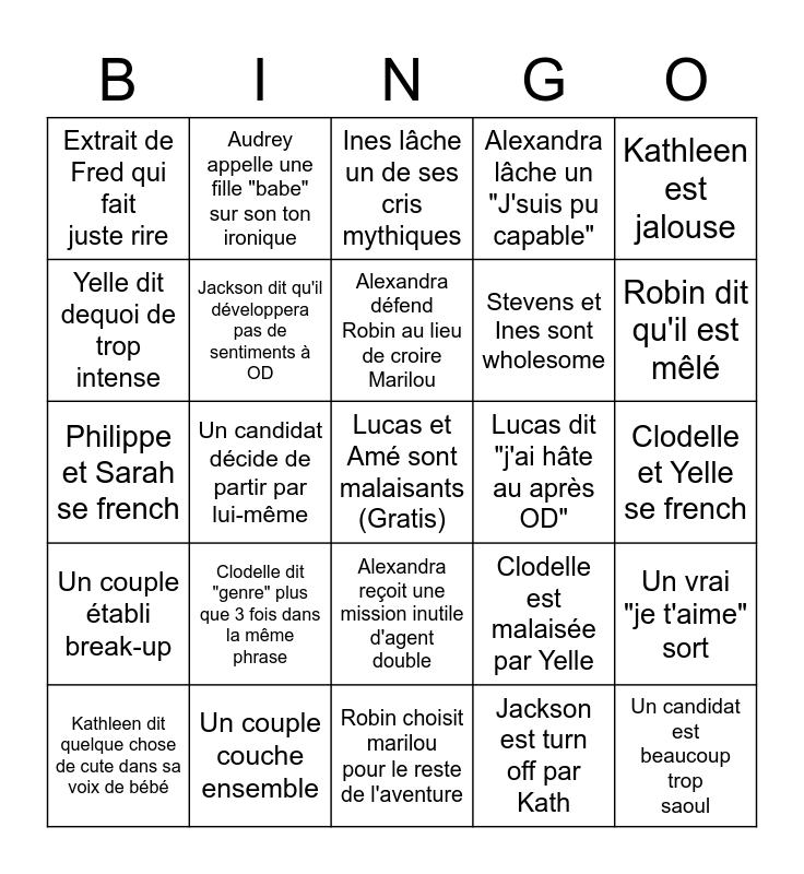 This bingo card has a free space and 25 words: Kathleen dit quelque chose de cute dans sa voix de bébé, Clodelle dit "genre" plus que 3 fois dans la même phrase, Alexandra défend Robin au lieu de croire Marilou, Jackson est turn off par Kath, Robin dit qu'il est mêlé, Extrait de Fred qui fait juste rire, Audrey appelle une fille "babe" sur son ton ironique, Ines lâche un de ses cris mythiques, Stevens et Ines sont wholesome, Un vrai "je t'aime" sort, Philippe et Sarah se french, Jackson dit qu'il développera pas de sentiments à OD, Clodelle est malaisée par Yelle, Un candidat est beaucoup trop saoul, Yelle dit dequoi de trop intense, Un couple couche ensemble, Robin choisit marilou pour le reste de l'aventure, Alexandra lâche un "J'suis pu capable", Clodelle et Yelle se french, Un couple établi break-up, Un candidat décide de partir par lui-même, Alexandra reçoit une mission inutile d'agent double, Lucas dit "j'ai hâte au après OD", Kathleen est jalouse and Kathleen dit quelque chose de cute dans sa voix de bébé.