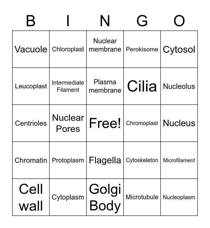 This bingo card has a free space and 24 words: Protoplasm, Cytoplasm, Plasma membrane, Cell wall, Cytosol, Vacuole, Leucoplast, Chloroplast, Chromoplast, Flagella, Cilia, Centrioles, Cytoskeleton, Microfilament, Intermediate Filament, Microtubule, Nucleus, Nuclear membrane, Nucleolus, Nuclear Pores, Nucleoplasm, Chromatin, Perokisome and Golgi Body.