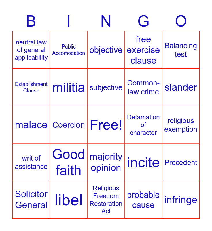 This bingo card has a free space and 34 words: warrant, probable cause, consent, allegation, writ of assistance, militia, Balancing test, Solicitor General, Public Accomodation, Compelling governmental interest, subjective, objective, Freedom of Association, Prior restraint, Defamation of character, slander, libel, malace, Good faith, incite, majority opinion, dissenting opinion, neutral law of general applicability, religious exemption, Religious Freedom Restoration Act, infringe, free exercise clause, Sherbert Test, Common-law crime, Establishment Clause, Sanctioned, Coercion, Precedent and Lemon Test.
