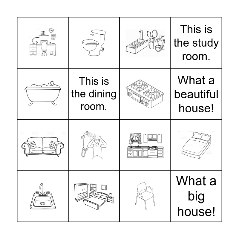 This bingo card has 14 images and 6 words: This is the dining room., What a big house!, This is our classroom., What a beautiful house!, This is the study room. and What a scary basement!.