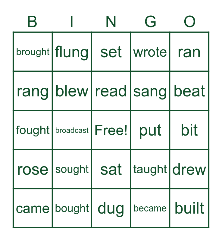 This bingo card has a free space and 24 words: sought, bought, read, came, ran, brought, rang, flung, put, sat, sang, fought, taught, drew, blew, became, bit, set, beat, broadcast, built, rose, wrote and dug.