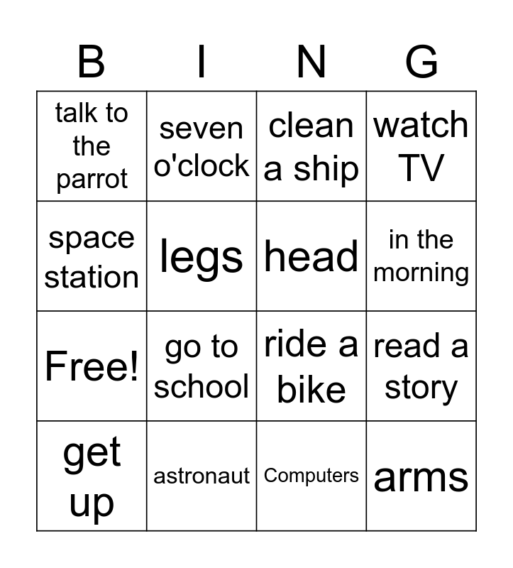This bingo card has 20 words: read a story, sleep, clean a ship, play the piano, get up, space station, astronaut, talk to the parrot, Free!, seven o'clock, go to school, ride a bike, legs, arms, head, foot, in the morning, watch TV, Computers and play basketball.