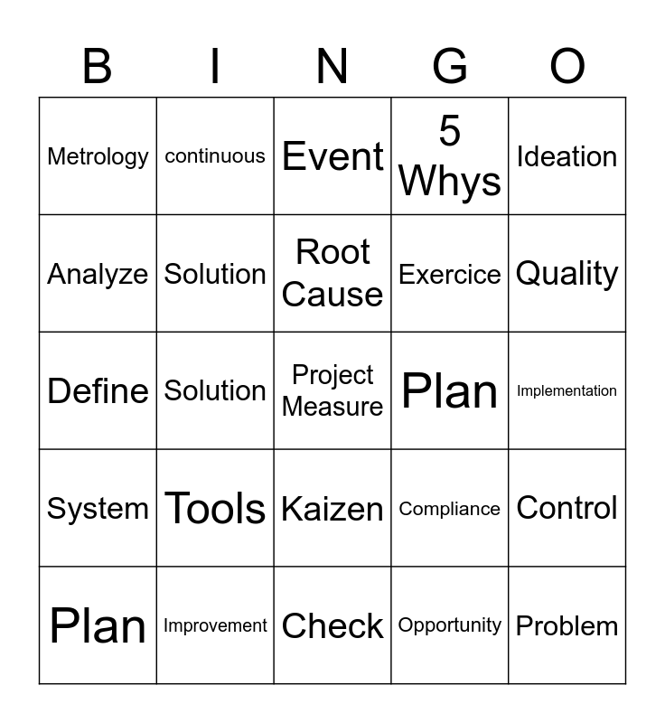 This bingo card has a free space and 24 words: Tools, Improvement, Root Cause, Plan, Ideation, Metrology, Analyze, continuous, Plan, Kaizen, Exercice, Define, Compliance, Control, Solution, Opportunity, Implementation, Event, Quality, Solution, Problem, System, 5 Whys and Check.