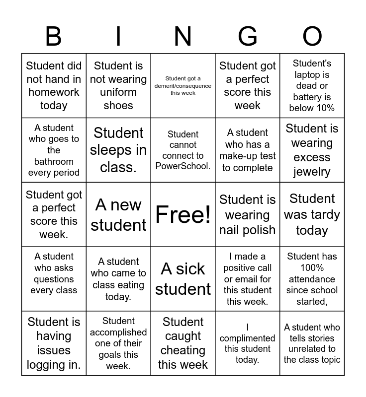 This bingo card has a free space and 24 words: A student who came to class eating today., Student accomplished one of their goals this week., Student cannot connect to PowerSchool., Student is having issues logging in., Student's laptop is dead or battery is below 10%, Student did not hand in homework today, A student who goes to the bathroom every period, Student is not wearing uniform shoes, Student is wearing nail polish, A sick student, A student who has a make-up test to complete, Student got a perfect score this week., I made a positive call or email for this student this week., Student has 100% attendance since school started,, Student sleeps in class., I complimented this student today., Student was tardy today, Student got a demerit/consequence this week, Student is wearing excess jewelry, A new student, A student who tells stories unrelated to the class topic, A student who asks questions every class, Student got a perfect score this week and Student caught cheating this week.