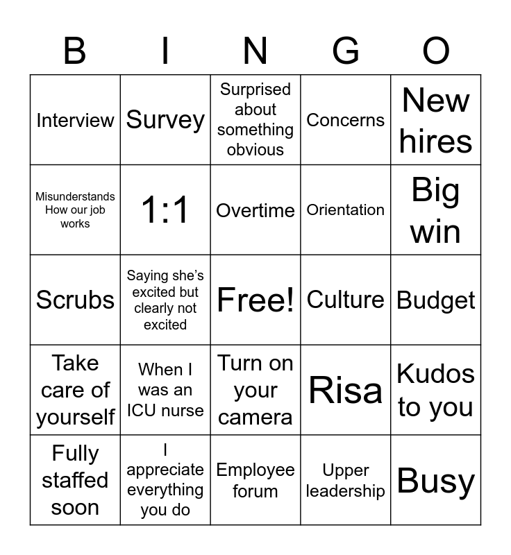 This bingo card has a free space and 24 words: When I was an ICU nurse, I appreciate everything you do, Overtime, Fully staffed soon, New hires, Interview, Misunderstands How our job works, Survey, Culture, Turn on your camera, Orientation, Scrubs, Risa, Kudos to you, 1:1, Upper leadership, Budget, Surprised about something obvious, Big win, Saying she’s excited but clearly not excited, Busy, Take care of yourself, Concerns and Employee forum.
