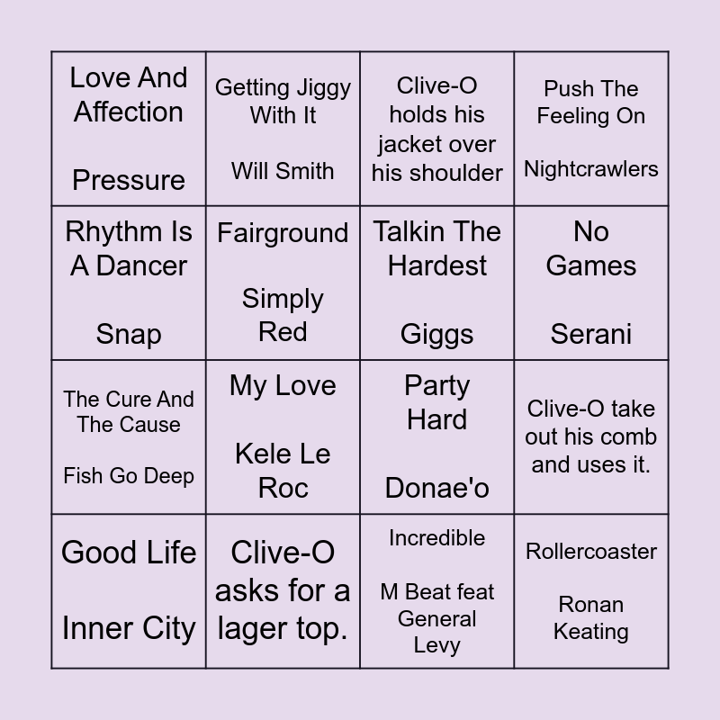 This bingo card has 52 words: Homerton B Unknown T, Good Life Inner City, Little bit Of Luck DJ Luck and Mc Neat, Clive-O mentions Butlins, DJ Icarus takes a selfie, Baby Cakes 3 Of A Kind, Getting Jiggy With It Will Smith, Movin Too Fast Artful Dodger, Fairground Simply Red, Clive-O says something in another language, Talkin The Hardest Giggs, Back To Life Soul II Soul, Clive-O changes his tie, Be My Lover La Bouche, Never Gonna Let You Go Tina Moore, Neighbourhood Zed Bias, No Games Serani, Clive-O asks for a lager top., Boooo! Ms Dynamite, Rhythm Is A Dancer Snap, Clive-O take out his comb and uses it., It's Raining Men The Weather Girls, Love And Affection Pressure, The Cure And The Cause Fish Go Deep, Little Man Sia, Body Tion Wayne & Russ Millions, 21 Seconds So Solid Crew, Ain't Nobody Chaka Khan, My Love Kele Le Roc, Who Am I Been Man, Stayin Alive Bee Gees, Push The Feeling On Nightcrawlers, Believe Cher, Fairground Simply Red, Night Nurse Gregory Isaacs, Clive-O holds his jacket over his shoulder, Girls like us B15 Projet, I love you baby The Original, Clive dances to jungle, Tempted To Touch Beres Hammond, Sorry Monster Boy, Incredible M Beat feat General Levy, Rollercoaster Ronan Keating, Ride On Time Black Box, Set You Free N-Trance, Pump Technotronic, In The Morning Egypt, Party Hard Donae'o, Sweet Caroline Neil Diamond, Do Ya Think I'm Sexy Rod Stewart, Original Nuttah UK Apache & Shy FX and Way Too Sexy Drake & Future.