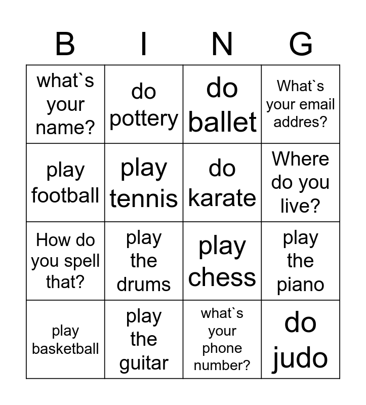 This bingo card has 16 words: play the guitar, play the piano, do ballet, what`s your name?, How do you spell that?, do pottery, play chess, what`s your phone number?, play football, play tennis, play basketball, What`s your email addres?, play the drums, Where do you live?, do karate and do judo.