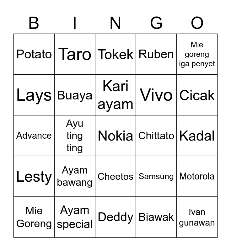 This bingo card has a free space and 24 words: Ayam bawang, Ayam special, Kari ayam, Mie Goreng, Mie goreng iga penyet, Potato, Lays, Taro, Chittato, Cheetos, Vivo, Advance, Samsung, Motorola, Buaya, Biawak, Kadal, Tokek, Cicak, Ayu ting ting, Ivan gunawan, Lesty, Ruben and Deddy.
