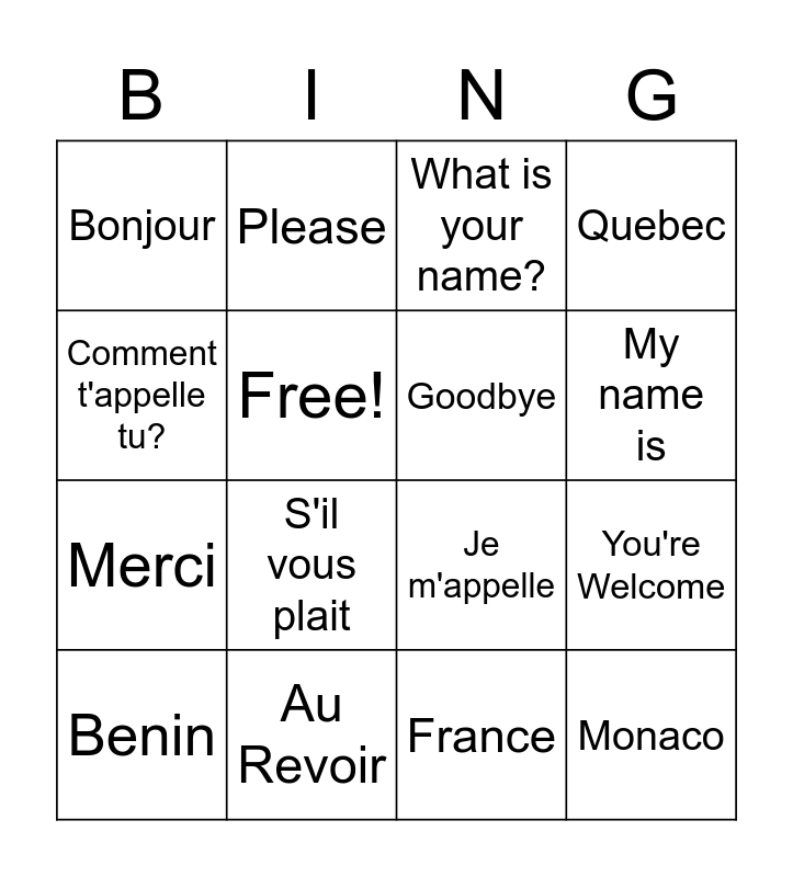 This bingo card has 24 words: Hi!, Français, My name is, French, Comment t'appelle tu?, Bonjour, Free!, Please, Au Revoir, Thank you, Merci, Je m'appelle, Salut, De Rien, Goodbye, Hello, France, What is your name?, S'il vous plait, You're Welcome, Benin, Monaco, Quebec and Senegal.