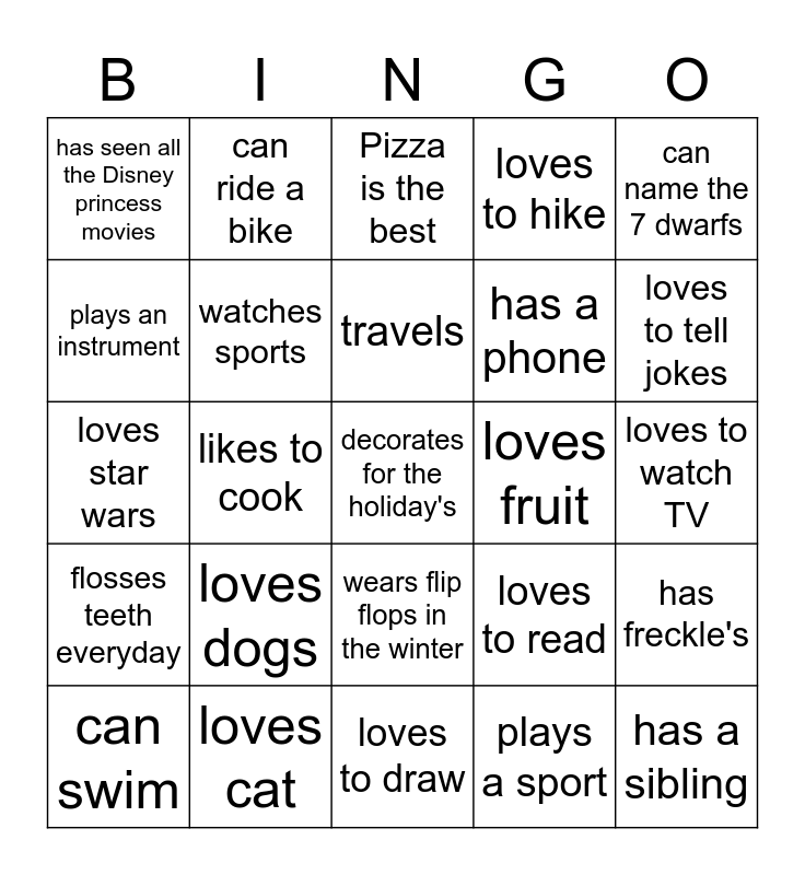 This bingo card has a free space and 24 words: loves dogs, loves cat, travels, can swim, can name the 7 dwarfs, has seen all the Disney princess movies, plays an instrument, can ride a bike, loves fruit, wears flip flops in the winter, has a phone, loves star wars, loves to read, has freckle's, watches sports, plays a sport, loves to watch TV, Pizza is the best, loves to tell jokes, likes to cook, has a sibling, flosses teeth everyday, loves to hike and loves to draw.