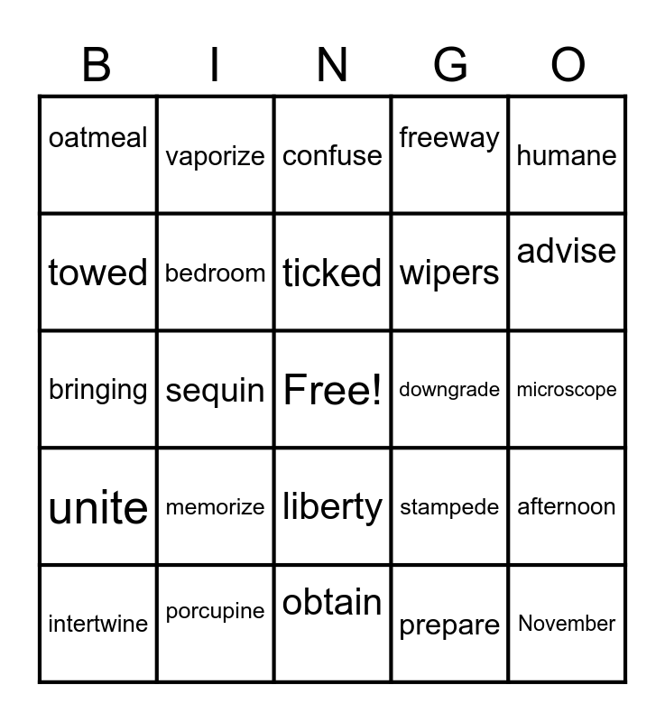 This bingo card has a free space and 24 words: memorize, porcupine, ticked, intertwine, humane, oatmeal, towed, vaporize, downgrade, liberty, wipers, bringing, stampede, afternoon, bedroom, prepare, microscope, confuse, advise, sequin, November, unite, freeway and obtain.