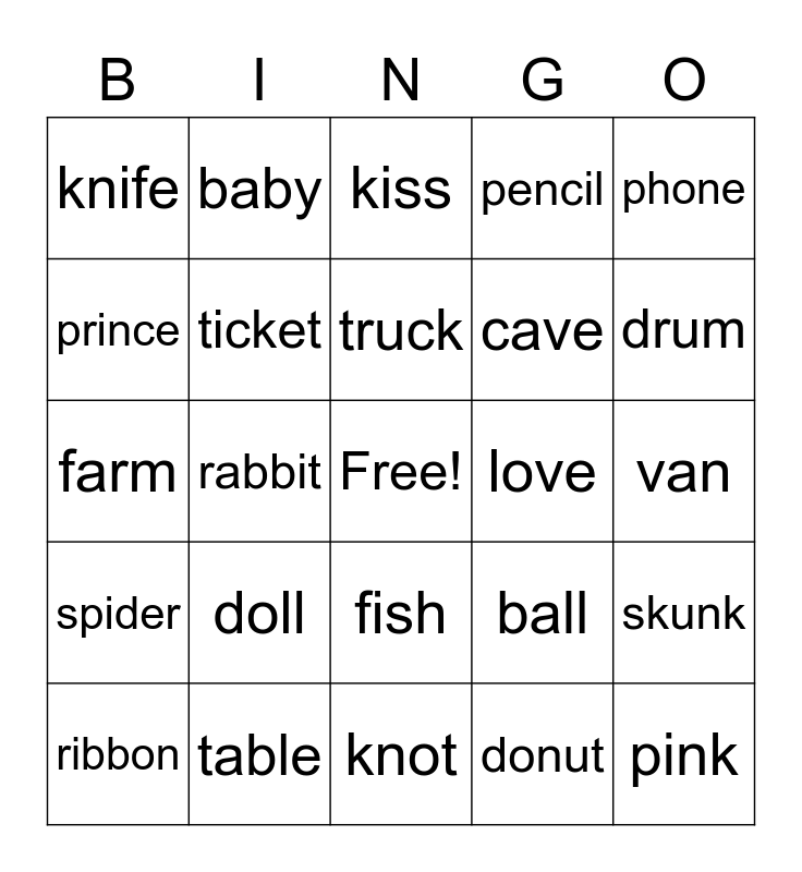 This bingo card has a free space and 24 words: doll, table, truck, ribbon, phone, knife, prince, baby, love, fish, cave, farm, ball, skunk, ticket, donut, van, kiss, drum, rabbit, pink, spider, pencil and knot.