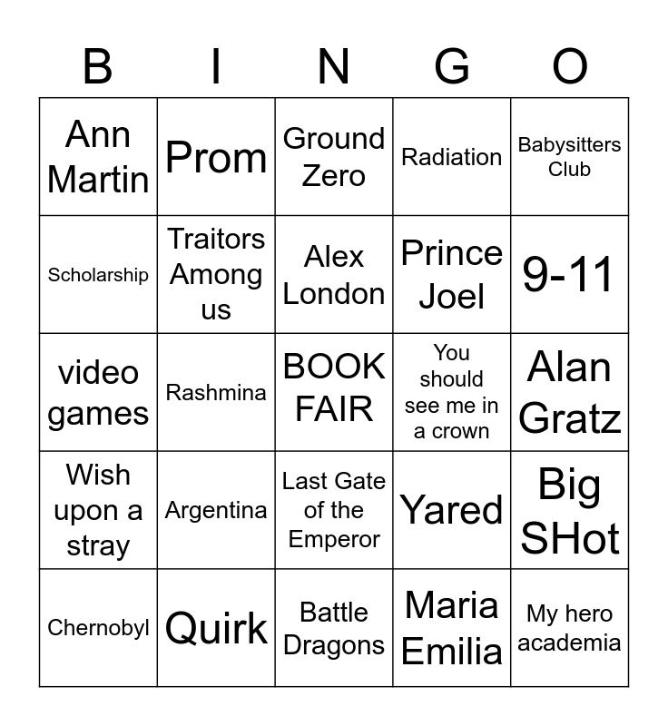 This bingo card has a free space and 25 words: Argentina, Battle Dragons, Alex London, Chernobyl, Babysitters Club, Ann Martin, Scholarship, Prom, You should see me in a crown, Last Gate of the Emperor, Prince Joel, video games, Yared, Big SHot, Traitors Among us, Nazis, Alan Gratz, Ground Zero, 9-11, Rashmina, My hero academia, Quirk, Wish upon a stray, Radiation and Maria Emilia.