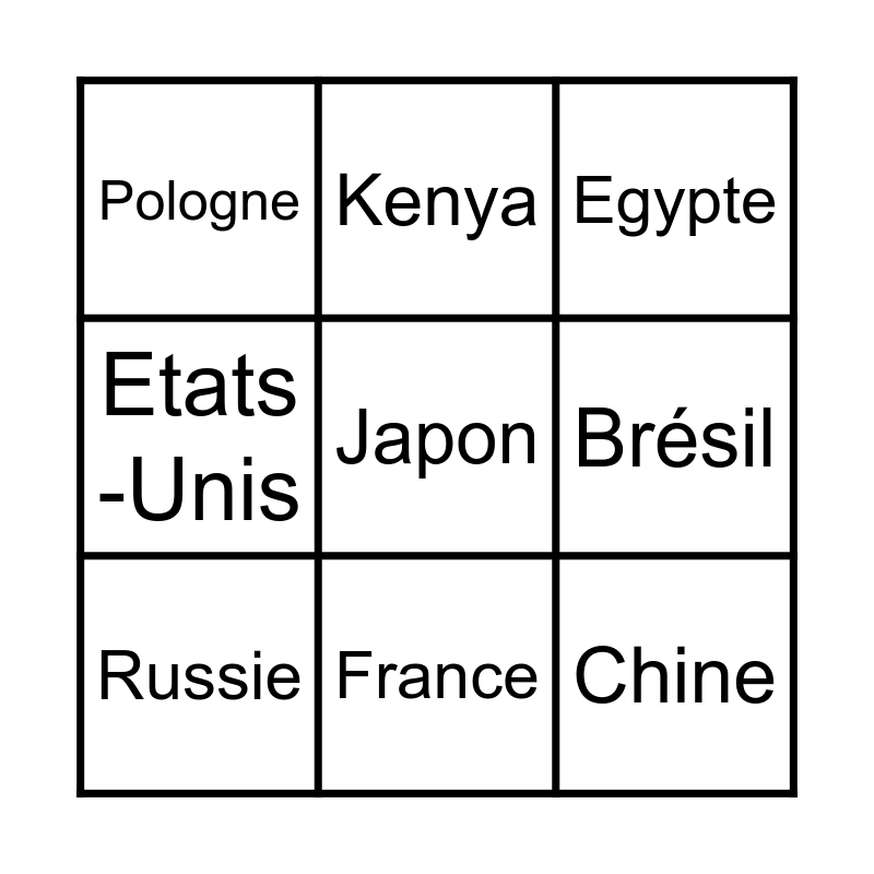 This bingo card has a free space and 8 words: Brésil, Egypte, Kenya, Russie, Pologne, Chine, Etats -Unis and France.